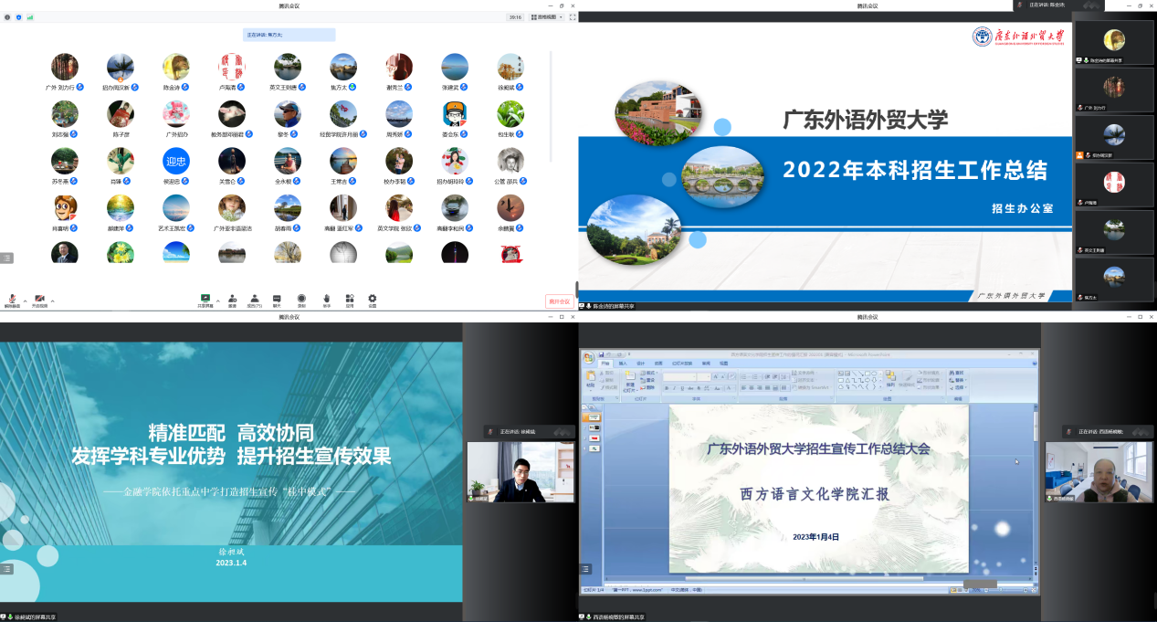 会上,教务部部长、招生办主任陈金诗从招生计划执行情况、特殊类招生考试、招生宣传、招生录取情况、生源质量分析、下一步工作等方面对我校本科招生工作做了全面的总结。金融学院党委书记徐昶斌、西语学院院长杨晓敏分别分享了本学院在招生宣传工作上的经验,并对今后的招生宣传工作提出建议。