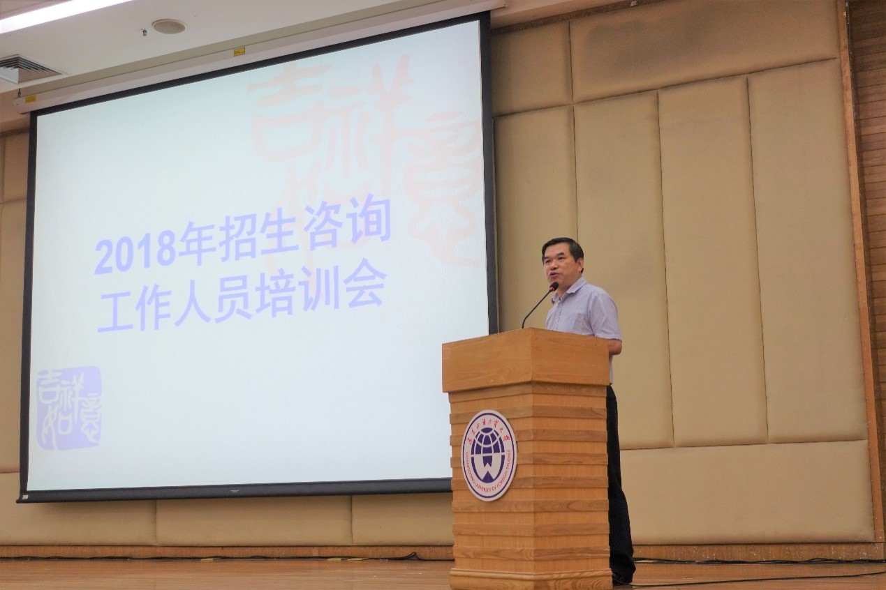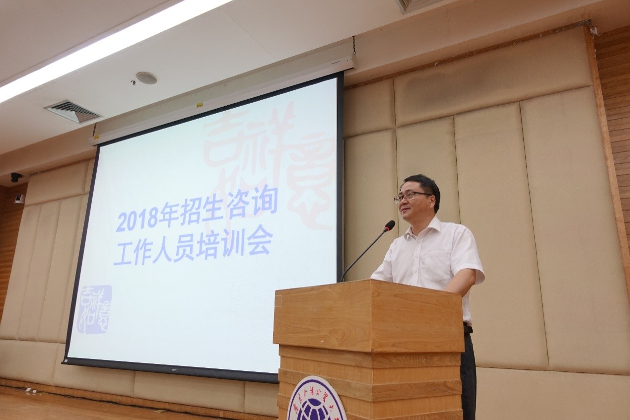 随后,教务处副处长迟殿堂从招生政策解读、学校宣传亮点和考生家长关心的热点问题等方面进行了培训。