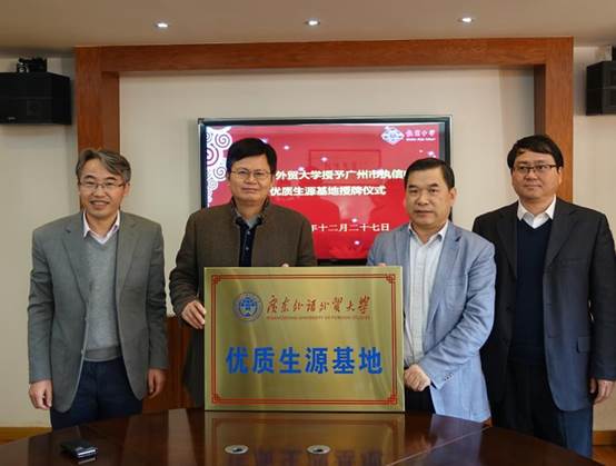 随后,举行了广东外语外贸大学与执信中学共建“优质生源基地”签约和授牌仪式。执信中学副校长陈民和我校教务处处长兼招生办主任袁长青、副处长迟殿堂等参加会谈并出席签约和授牌仪式。