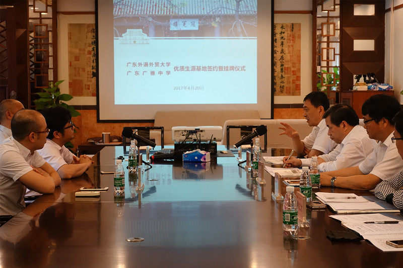 本网讯4月20日,广东外语外贸大学与广东广雅中学共建“优质生源基地”签约和授牌仪式在广东广雅中学举行。我校党委书记隋广军、副校长焦方太、教务处处长兼招生办公室主任袁长青等与广雅中学党委书记何冠南等进行了友好会谈。
