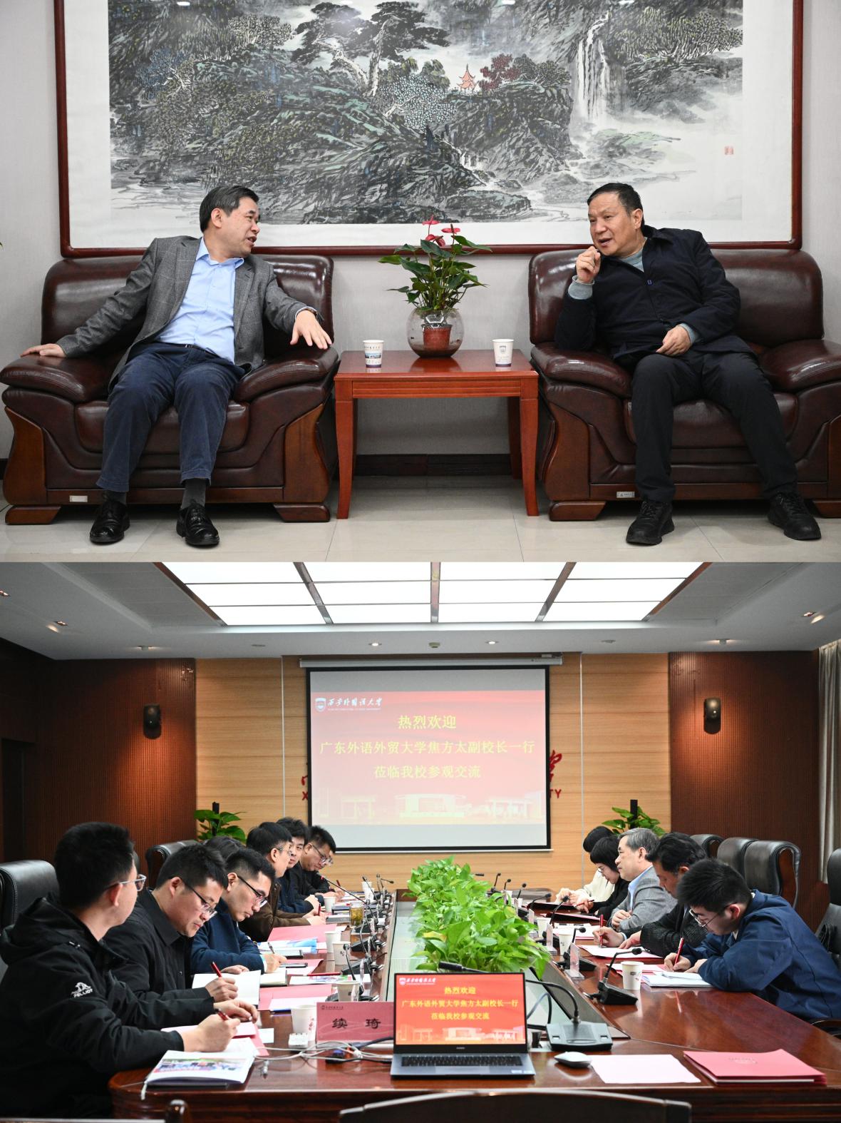 在西安外国语大学座谈会上,焦方太介绍了广外的办学近况,并肯定了西外近年来的办学成果,希望借此机会深入学习互鉴,进一步拓宽办学思路,推动本科教育高质量发展。西安外国语大学党委书记白黎指出,近年来广外办学成绩突出,在多个方面“走在前列”。希望两校能搭建合作共赢的桥梁,加强沟通协作。副校长姜亚军简要介绍了学校的历史沿革和发展情况。他指出,两校均肩负着为“一带一路”倡议提供人才和智力支持的重要使命,希望进一步拓展合作,培养更多高水平复合型人才。双方还就专业建设、人才培养、外语教育改革、本科招生、创新班建设等议题进行了深入交流。