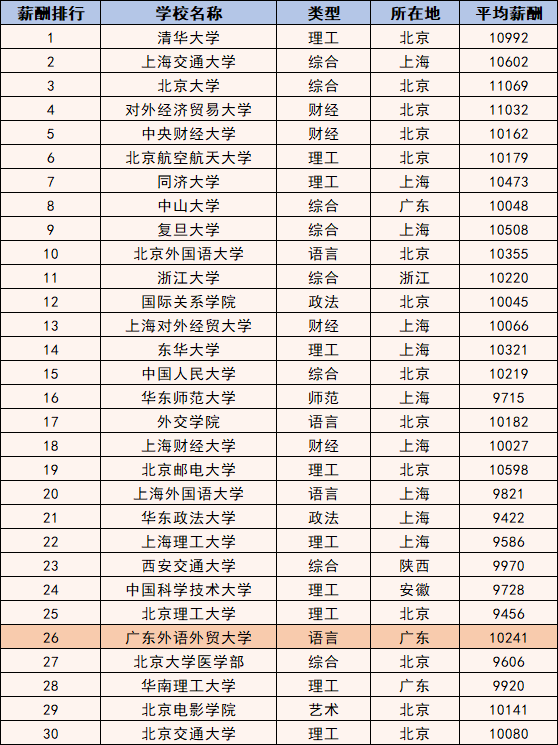 第三方调研数据显示,我校毕业生平均月薪在全国高校中连年居于前列,广东省首位。2021年,根据中国薪酬网发布的《2021中国高校毕业生薪酬指数排行》显示,我校毕业生平均薪酬为10241元,排全国第10位,广东省第1位。2020年,根据中国薪酬网发布的《2020中国高校毕业生薪酬指数排行》显示,我校毕业生平均薪酬为10271元,排全国第13位,广东省第1位。