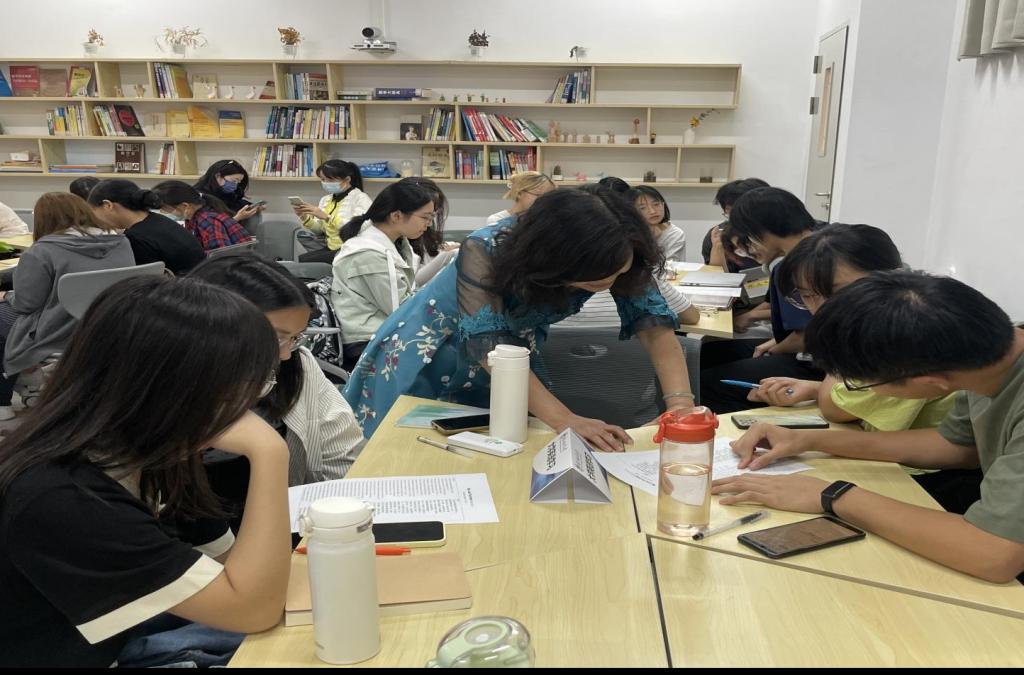 本次英语文学赏析工作坊吸引到了来自全校不同学院的合计30名学生参加,张兰围绕英文戏剧科普、Freeze定格热身表演、戏剧文本阅读讨论、戏剧演绎四个环节展开讲解。“每个人都可以演五分钟的戏剧”,她利用戏剧《深夜小狗离奇事件》导入,科普了英文戏剧以及讲解了扮演者如何运用肢体语言进行表演,呼吁同学们积极参与到戏剧演绎中来。形式多样、趣味十足的定格表演打破了传统的课堂教学,张兰一边指导学生加深理解本次演绎的戏剧《前公爵夫人的微笑》文本阅读,一边开展课堂讲学,讲授文本重难点知识。