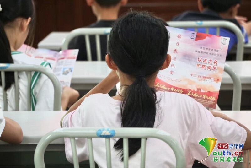 青少年们在认真阅读广外法援实践队普法宣传册(本次活动获得中国青年网报道)