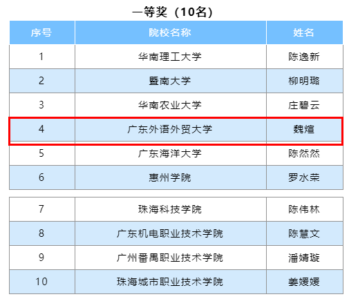 近日,广东省教育厅公布第九届广东高校辅导员素质能力大赛结果。我校辅导员魏煊荣获大赛一等奖。