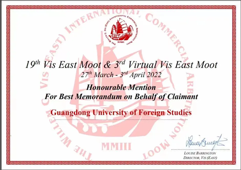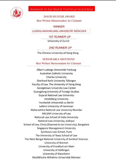 近日,第十九届Vis East国际商事仲裁模拟仲裁庭比赛(Willem C. Vis East International Commercial Arbitration Moot)于线上举行。经过四天循环赛的激烈角逐,我校代表队从来自世界各国的140支队伍中脱颖而出,获得申请方最佳书状荣誉提名(位列全球第十)。在本次比赛中,我校代表队是中国大陆高校在该持方唯一获得最佳书状荣誉提名奖的队伍,实现了我校赛队在该国际赛事中的历史性突破。