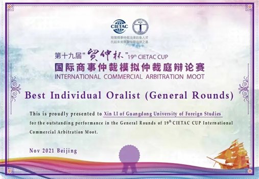 荣获第十九届“贸仲杯”国际商事仲裁模拟仲裁庭辩论赛全国二等奖