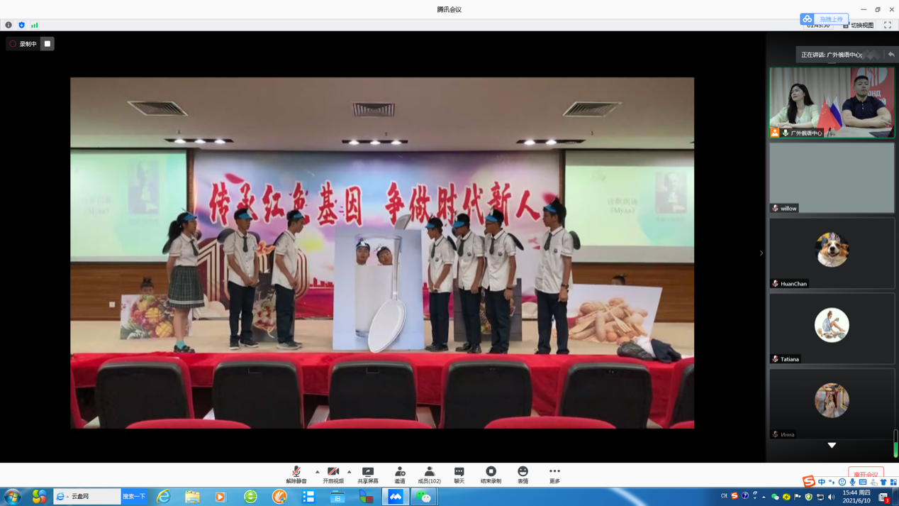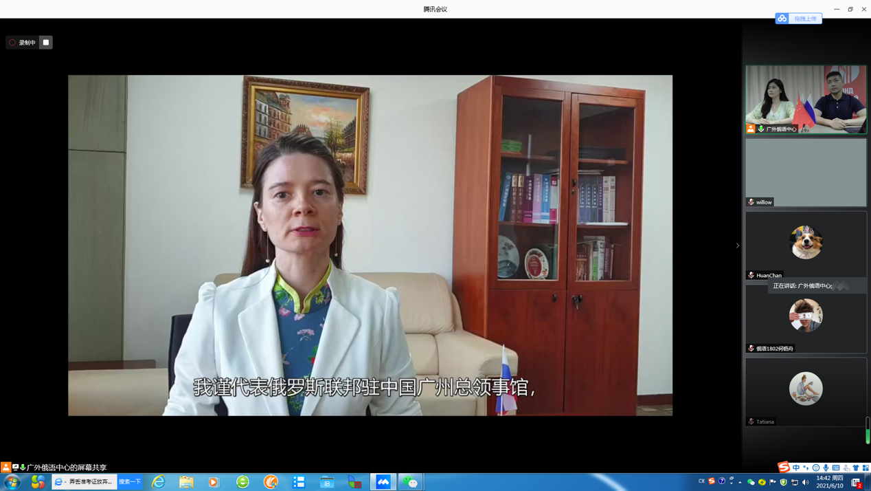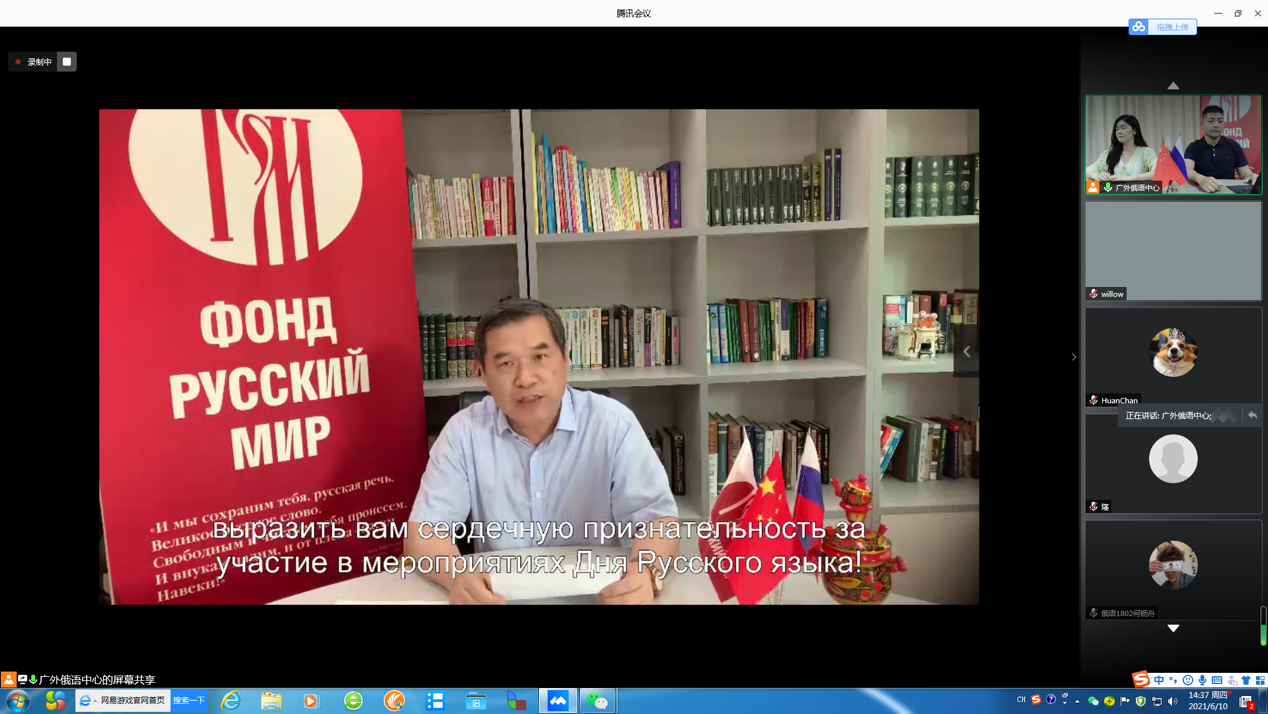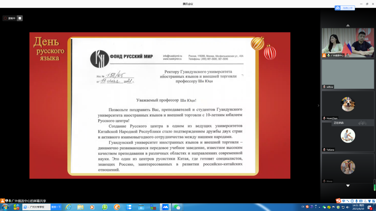 本网讯 6月10日,我校俄语中心第十届“俄语日”活动线上举办。校长石佑启和“俄语世界”基金会执行主席弗拉基米尔·维亚契斯拉沃维奇·科琴就“俄语中心”成立十周年互致贺信。副校长焦方太,俄罗斯驻广州总领事馆副领事玛丽娜·楚穆里娜分别为本届“俄语日”致辞。中俄双方都对双方一直以来积极高效的合作表示高度肯定,并希望通过举办“俄语日”等活动,进一步推动中俄人文交流发展,促进中俄全面战略协作伙伴关系继续深入。