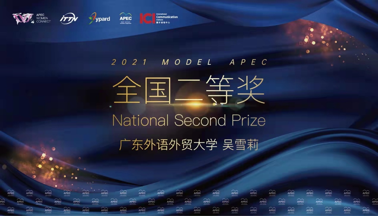 经过层层选拔,我校派出由吴雪莉(高翻2003)、吴与萱(高翻2003)、张艳(法英1903)、李锡鹏(国际商务创新班2001)、揭一洪天(国际商务创新班2001)等同学组成代表团参加比赛。由于学校疫情防控需要,广外代表团以线上的形式参与比赛。广外代表团克服困难,排除万难,经过激烈角逐,我校翻译学院学子吴雪莉同学获大学组全国二等奖。
