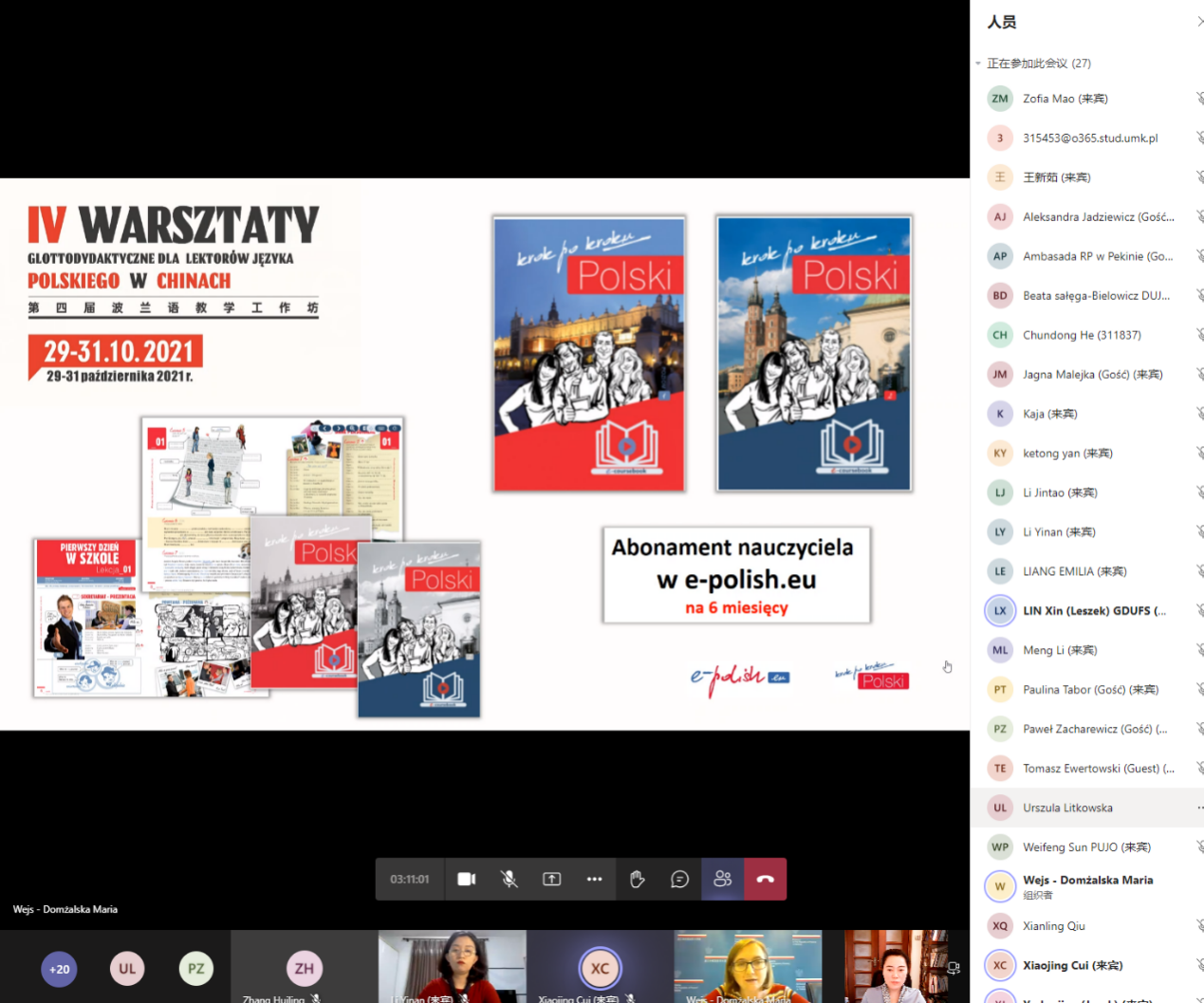 本网讯 10月29至31日,由我校西语学院波兰语系与波兰共和国驻华大使馆、波兰文化处联合策划主办的第四届“全国波兰语教学工作坊”(IV Warsztaty Glottodydaktyczne dla Lektorów Języka Polskiego w Chinach)以视频会议的形式成功举行。作为本届工作坊的主办方之一,我校波兰语系全体教师团队出席了开幕式。
