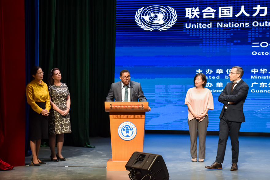 本网讯 10月15日上午,联合国人力资源外联项目宣介会(广州站)在我校北校区举办。人力资源社会保障部国际交流服务中心主任付跃钦和联合国驻维也纳办事处/联合国毒品和犯罪问题办公室(UNOV/UNODC)人力资源管理主任黛博拉·恩斯特率领联合国人力资源外联代表团来校宣介。我校校长石佑启出席宣介会并致辞。