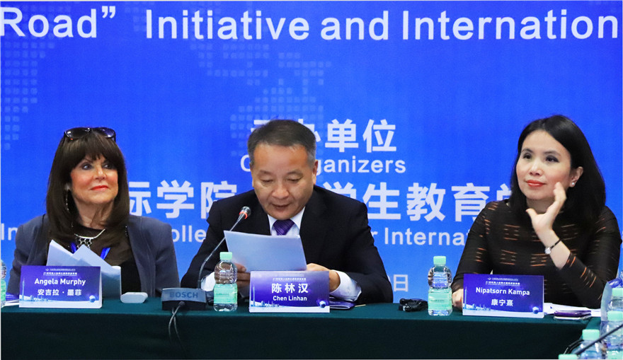 泰国驻广州总领事馆副总领事康宁熹、英国中央兰开夏大学原常务副校长安吉拉·墨菲、我校国际学院院长梁学宏、留学生教育学院院长蔡红、香港明爱屯门马登基金中学校长袁国明、东莞翰林实验学校国际部校长雅各布· 帕夫利克、英国中央兰开夏大学中国区负责人葛继飞、英国考文垂大学讲师弗雷德· 帕克与弗雷德里克· 马科维茨、我校留学生教育学院也门留学生佳木相继发表了主旨演讲并就“一带一路”国际化教育的理念、政策及实施等进行了讨论。国际学院副院长杨文慧主持论坛。