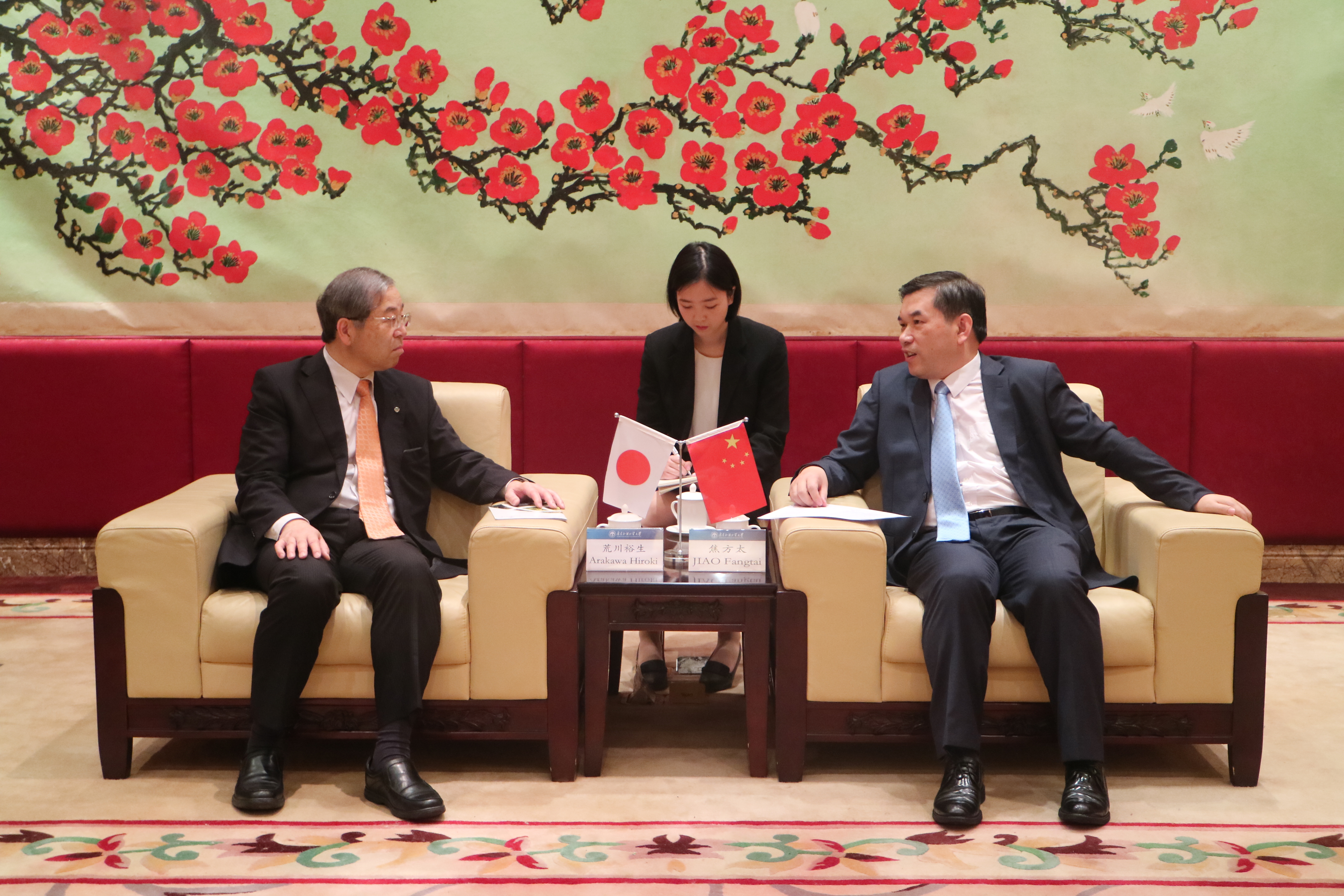 本网讯 4月22日,日本札幌大学理事长荒川裕生(Arakawa Hiroki)一行来访,我校副校长焦方太在北校区行政楼贵宾厅会见来宾。双方就加强两校交流合作、札幌大学孔子学院建设及加强中日友好交流等进行探讨。