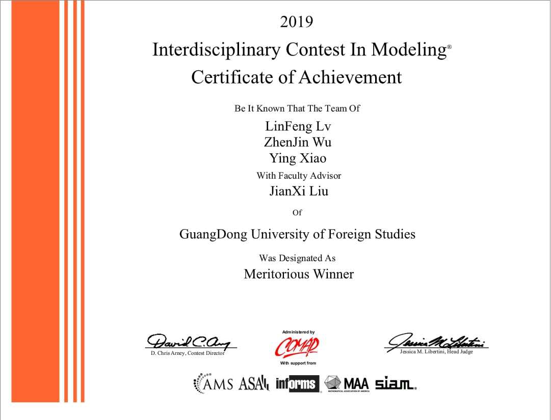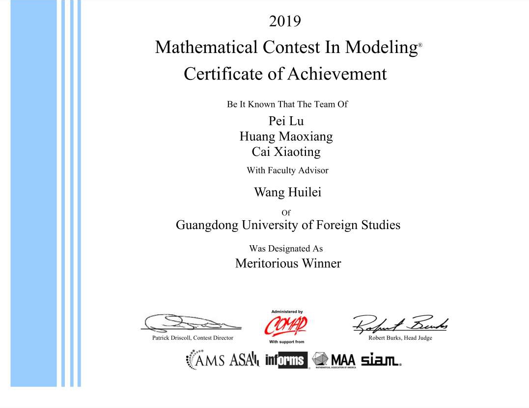 数学建模竞赛(MCM)一等奖证书