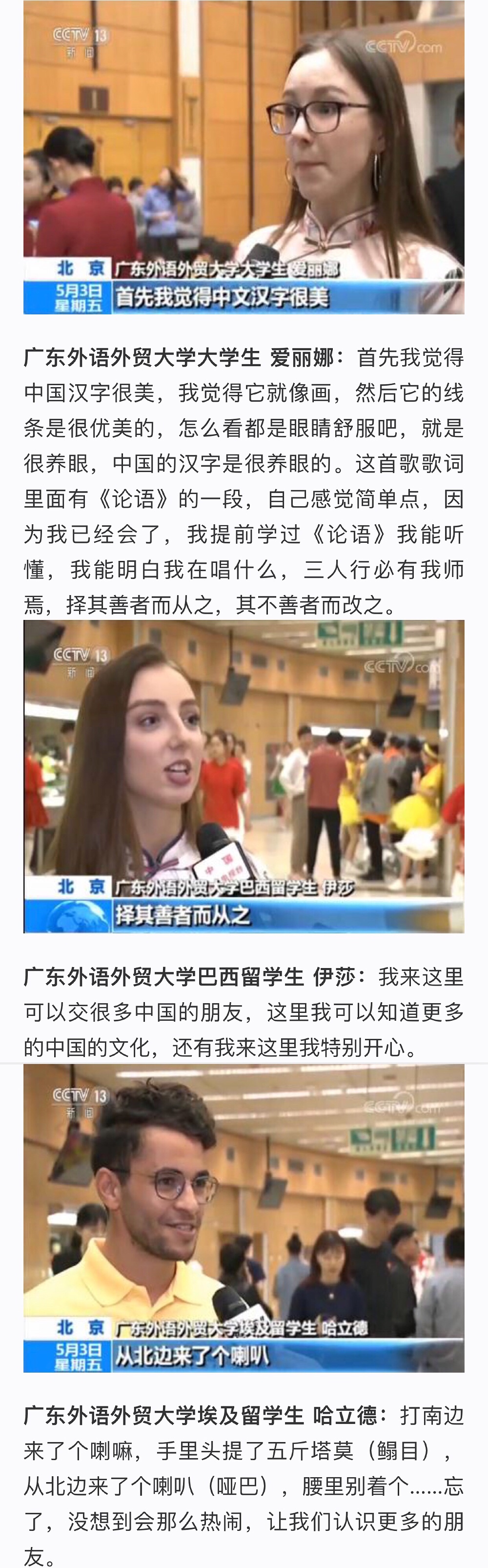 节目排练过程中,我校留学生代表接受央视《朝闻天下》栏目组的采访,面对镜头,他们用中文流利地讲述了参与本次文艺会演的体会和收获。其中,来自俄罗斯的陈星乐谈到:“汉字是一种优美的文字,学习中国歌曲可以深入的理解中国汉字的内涵”。而来自埃及的李小山和来自巴西的伊莎则重现了说唱部分和歌曲片段,同时表达了他们对中华文化的追求和热爱。5月3日,“学习强国”官方公众号也针对此次采访进行了相关宣传,向全国人民展现中外文化交流成果和中华优秀传统文化的动人魅力。
