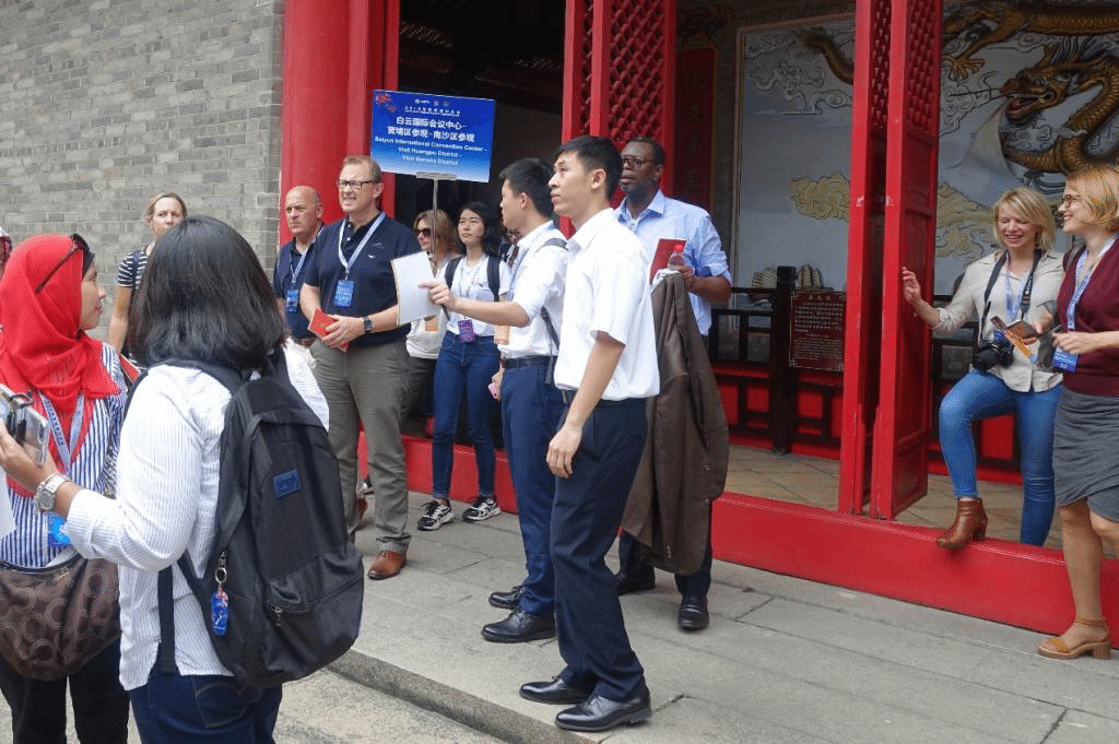 蔡嘉晖(右五)在南海神庙为与会嘉宾提供讲解翻译