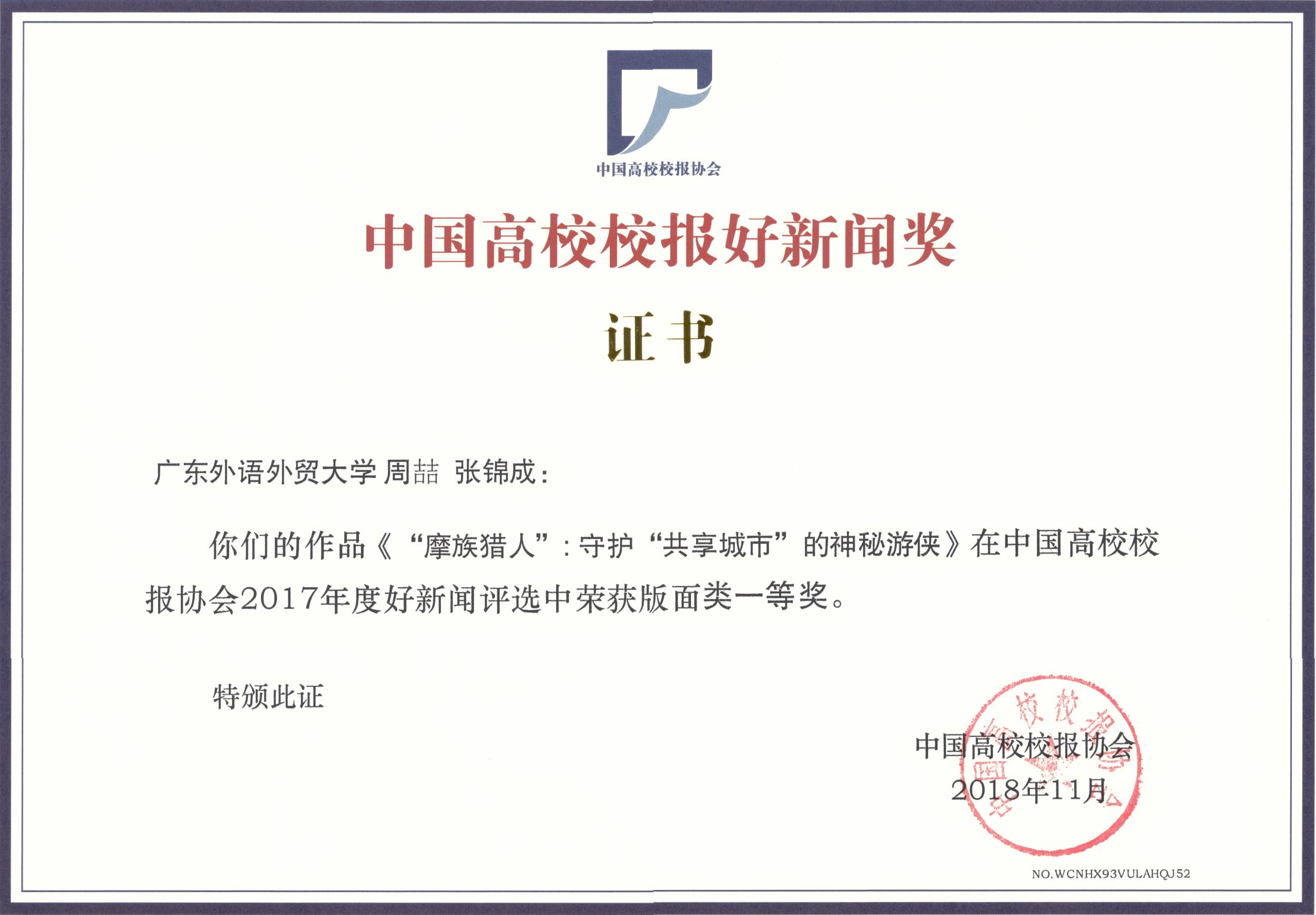 我校获奖的情况是:周喆、张锦成撰写的《“摩族猎人”: 守护“共享城市”的神秘游侠》获版面类一等奖;梁玲华、郑雅、彭雅琳采写的《粤首场全国公安英模事迹报告会进广外》获消息类一等奖;曹晨昱拍摄的《收获的喜悦·与父母见证》获摄影类二等奖;胡文涛、宾锐光采写的《弘扬广外价值观 提振学校精气神》获言论类三等奖;张洁莹采写的《郭桂杭:“把做一名好老师当作生命的一部分”》获通讯类三等奖;刘红艳的《我的广外,52岁生日快乐!》获新媒体类三等奖。