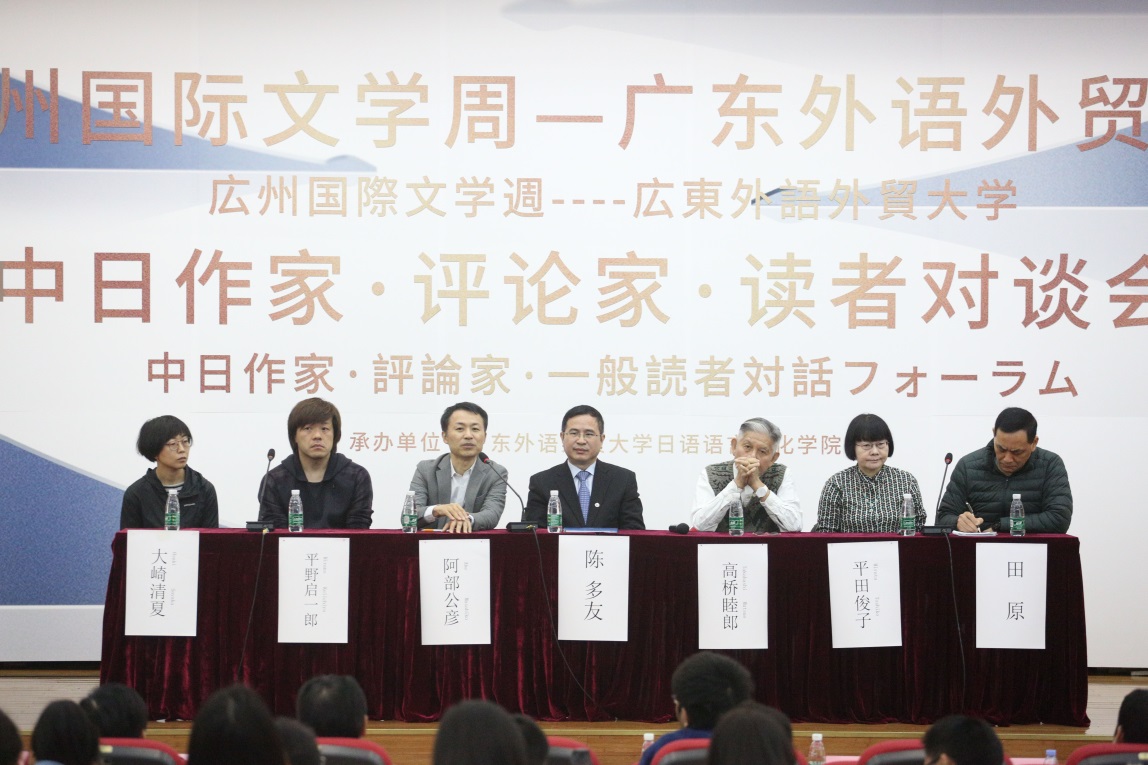 本网讯 12月17日上午,广州国际文学周——广东外语外贸大学中日作家·评论家·读者对谈会在我校北校区图书馆负一层学术报告厅举办。本次对谈会邀请到了中国作家协会主席团委员、广东省作家协会副主席杨克,平野启一郎、阿部公彦、高桥睦郎、平田俊子、大崎清夏等五位日本著名作家、诗人、翻译家以及旅日诗人田原到场。此次交流活动,为我校师生提供了近距离接触日本现代文学的机会,进一步加强了中日文学批评界的相互了解。