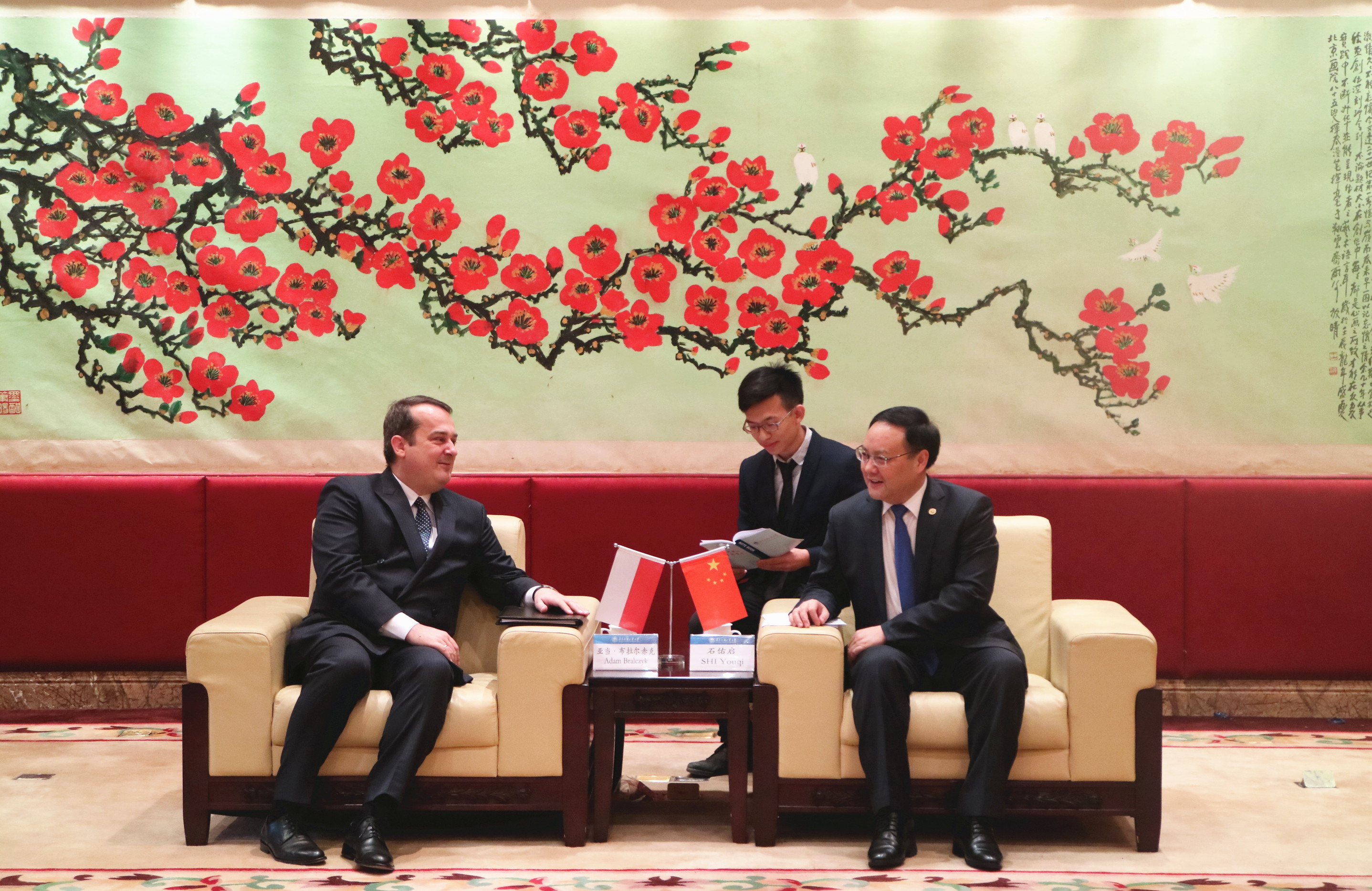 石佑启对亚当·布拉尔赤克一行的来访表示欢迎,并向其介绍了我校的基本情况,包括我校波兰语专业的建设情况。他指出,我校波兰专业成立于2014年,是全国第三家、华南地区首家获教育部批准的波兰语本科专业教学点。自专业建立以来,在学生培养、交流合作等方面取得了很大的成果。近年来,我校与波兰驻广州总领事馆一直保持良好的合作关系,我校感谢波兰驻广州总领馆对我校波兰语专业建设和发展的支持。希望通过此次访问,双方延续友好合作关系,推动我校波兰语专业建设及中波文化交流。