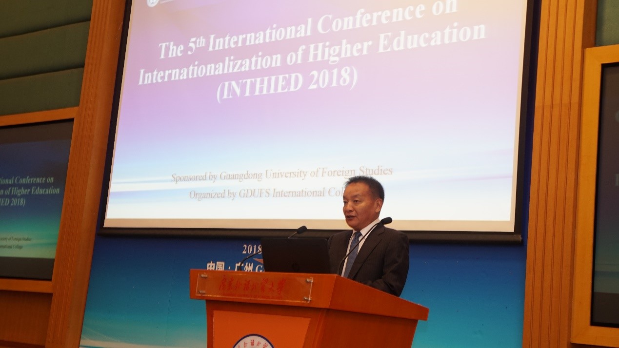 第五届高等教育国际化国际研讨会于2018年10月18日至19日在国际会议厅召开。世界多所知名大学的专家学者齐聚广外,围绕高等教育国际化的理论与实践、全球化背景下高等教育的机遇、挑战与策略、国际合作项目的教学与管理、跨文化因素影响下的教师与学生等主题进行交流研讨,总结国际教育合作经验。教育部留学服务中心副主任艾宏歌,广东省教育厅交流合作处处长李金俊,广外客座教授、原中国驻法国公使衔教育参赞白章德,原教育部考试中心(自考办)主任戴家干和教育部留学服务中心国际处副处长韩三军出席本次研讨会,会议由我校副校长陈林汉主持。