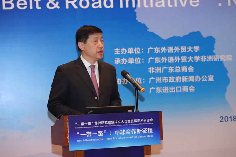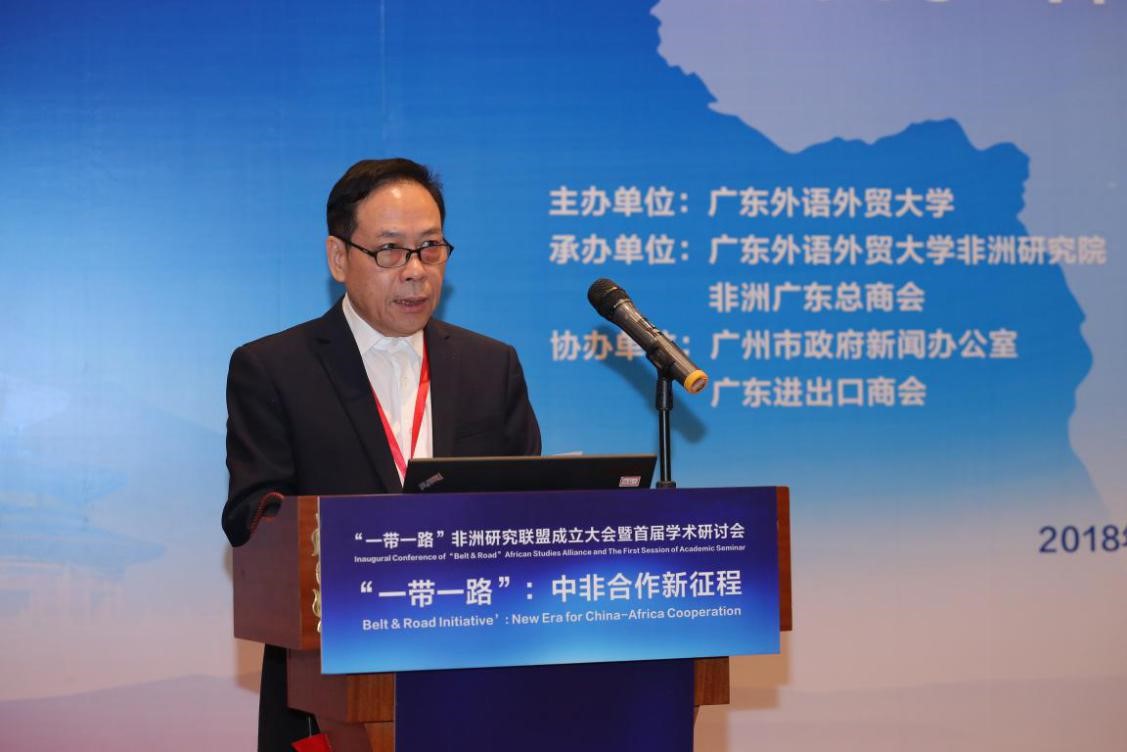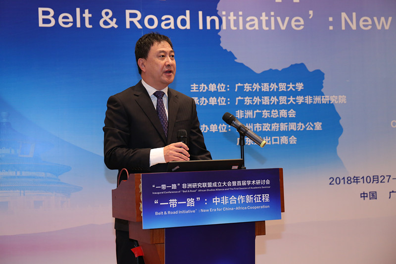 隋广军代表大学全体师生员工对各位专家、来宾莅临广外表示最热烈的欢迎和衷心的感谢。他在致辞中说,9月3-4日,第七届中非合作论坛在北京召开,会议以“合作共赢,携手构建更加紧密的中非命运共同体”为主题,中国国家主席发表了题为《携手共命运,同心促发展》的讲话,强调中非要携手共同打造责任共担、合作共赢、幸福共享、文化共兴、安全共筑、和谐共生的中非命运共同体,实施好产业促进、设施联通、贸易便利、绿色发展、能力建设、健康卫生、人文交流、和平安全八大行动。会议通过了关于构建更加紧密的《中非命运共同体的北京宣言》和《中非合作论坛-北京行动计划2019-2021》。第七届中非合作论坛,开启了全面合作携手共赢的新时代,借此东风,广东外语外贸大学和非洲广东总商会发起联合国内外34个单位,成立“一带一路”非洲研究联盟,并举办首届国际学术研讨会,这是中非学术界和企业界呼应北京宣言落实行动计划的良好开端。