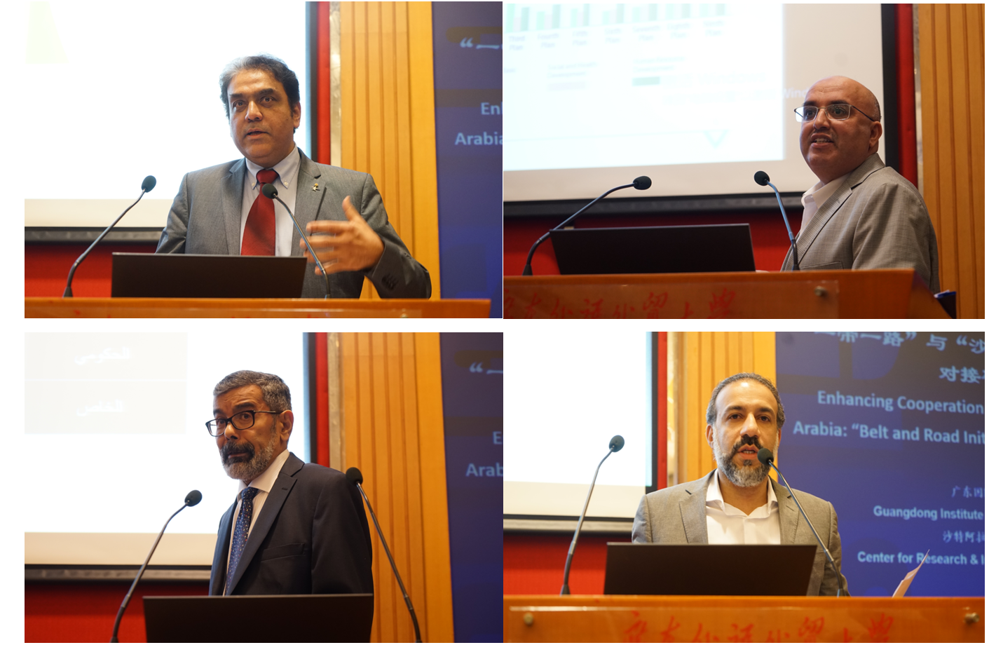 在随后的研讨会环节,共分为两节进行。研讨会第一节由叶海亚主持,研究员针对议题进行了主旨发言。Abdullah Alhugail根据民意调查结果,介绍了沙特公众对中国的认知。总体看起来,沙特民众认为中国是世界第二大经济体,中国具有十分重要的国际地位,中沙关系越来越重要,两国关系的发展是不断改善的、良性的。Turki Alzomaia从沙特历史经济、劳动力市场、国家债务以及竞争力等几个方面分析了沙特的经济状况。他认为,沙特的经济发展和石油价格密切相关,石油出口占到沙特总出口的70%,非石油出口仅占25%,希望可以把非石油出口提高到40%。实现可持续平衡的发展。“沙特阿拉伯2030愿景”是沙特国王提出的发展规划,其下有三个主题,一是构建朝气蓬勃的社会;二是要建立繁荣的经济;三是要加强联合国教科文遗产保护。Abdullah Alfarag指出“沙特阿拉伯2030愿景”要改变石油占沙特经济比重较大的经济结构,大力去促进私营经济的发展,将私营经济占GDP的重量提高到84%,减少失业率。他同时指出中国和沙特在石油业和旅游业等领域具有投资前景。Hohammed Alsadiq在演讲中提到“沙特阿拉伯2030愿景”要促进基建、教育、医疗、公共交通和住房五个主要产业的投资。他指出希望中国投资者除投资石油产业外,能够投资更多不同的行业,积极参与到愿景中。Ahmed Algarni从历史渊源方面指出中国和沙特早在古丝绸之路时期就互相往来,关系密切。丝绸之路从中国起源,然后一直到了阿拉伯半岛,通过现今的欧曼走到了阿拉伯内陆。他认为中国的GDP发展势头非常强劲,且中国经济在以非常迅猛的速度在增长。