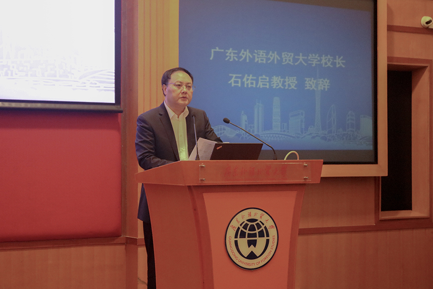 石佑启代表学校对全国各地的专家、学者的到来表示欢迎,提出我校“广植双创因、外树百业兴”的创新创业教育理念,介绍了我校创新创业教育的工作思路和发展规划,提出我校将按省教育厅的规划和部署,坚持不懈地为广东高校的创新创业改革贡献广外力量。他希望通过论坛的研讨及培训,助力我校及广东兄弟院校取得创新创业教育事业上更高质量的发展,同时祝愿与会人员通过本次论坛,交流新理念、探讨新路径、分享新成果。