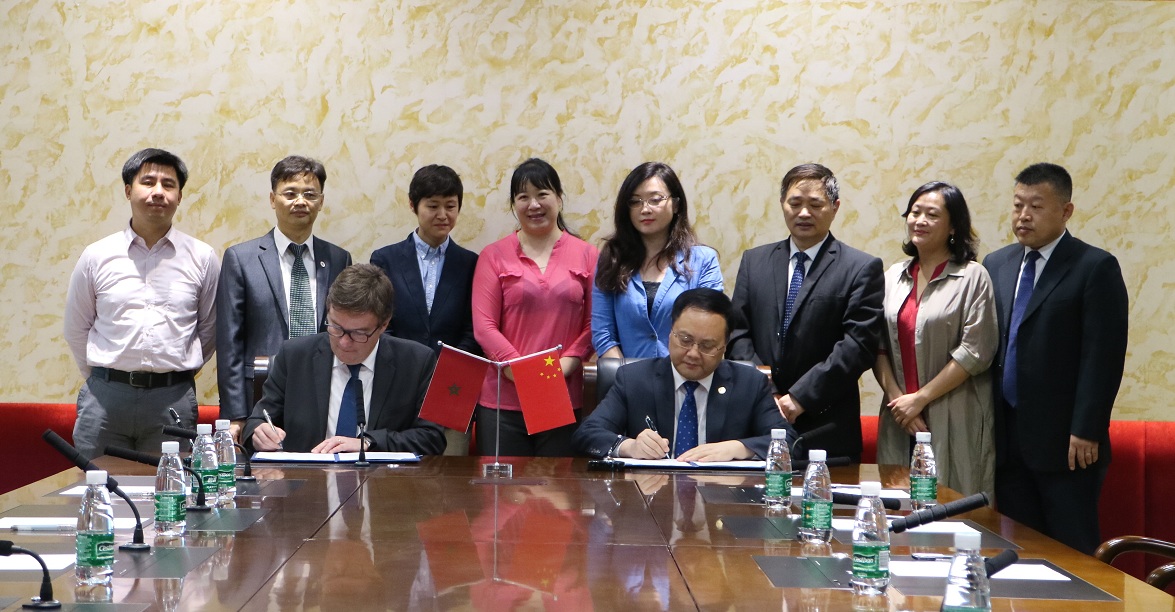 本网讯 11月16日,摩洛哥拉巴特商学院院长奥利维尔·阿普特尔(Olivier APTEL)一行来访,我校校长石佑启在北校区行政楼迎宾厅会见来宾。会谈后,双方在第一会议室举行两校合作备忘录及交换生项目的签约仪式。