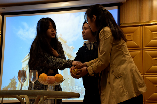 希腊语系的同学们展示了他们精心准备的节目。大一的同学们表演了根据希腊神话改编的舞台剧《金苹果之争》。同学们生动地展现了赫拉、雅典娜、阿芙洛狄忒三位女神为争夺金苹果而引发的一系列事件。大二的同学们则热情洋溢地演唱了希腊歌曲,受到在场观众的好评。