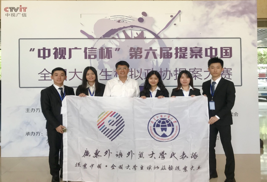 “提案中国•全国大学生模拟政协提案大赛”鼓励学生关注社会热点问题,深入基层开展调研,并在此基础上撰写模拟提案,致力于培养大学生理论联系实际、校园联系社会、个人联系国家的精神。经过预赛的角逐,四个分赛场共有8支代表队进入决赛。经过决赛客观题环节、提案审议环节、调研展示及答辩环节,评委们综合各队提案文本成绩和现场表现进行评分。最终,我校代表队以总分89.78分位居第一,获得决赛一等奖;同时由于“调研成果丰硕、调研方法科学、应对方法可行”,广外获得了优秀调研单项奖“笃行奖”,并通过组委会微信公众号投票评选所获的“社会影响力奖”。法学院林茂辉、孙章季、英语教育学院郭进军等担任我校代表队的指导老师。