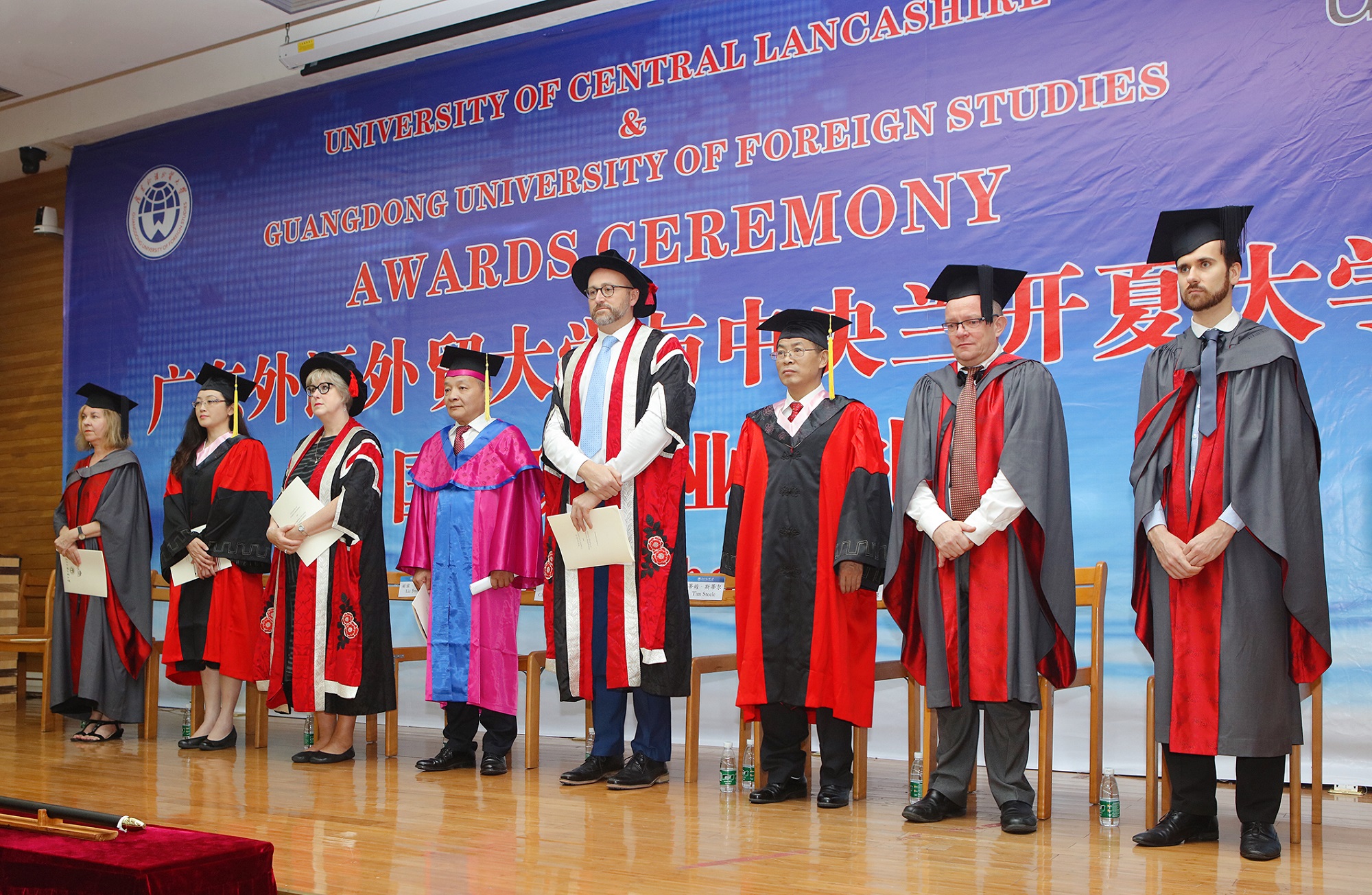 本网讯 6月27日下午,我校与英国中央兰开夏大学(以下简称兰开夏)国际班结业典礼在北校区图书馆多功能报告厅举行。兰开夏规划与国际战略高级副校长Liz Bromley、国际战略与合作事务副校长 Tim Steele,英国驻穗总领事Karen Maddocks,我校副校长陈林汉、国际合作交流处处长蔡红、副处长吴俊峰、国际学院副院长(主持工作)魏辉良、党总支副书记骆银以及两校教师代表和兰开夏国际项目学生、家长参加了仪式。