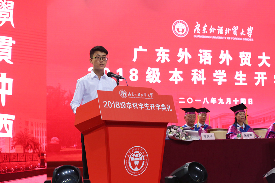 现任校学生会主席、来自经济贸易学院的伍云龙向新生们分享了三句话,与大家共勉:一是与祖国同心,与母校同行,一起做爱国荣校的广外人;二是立鸿鹄之志,担时代之责,一起做奋斗不息的广外人;三是学习出真知,实践悟真谛,一起做淬炼成钢的广外人。北校区新生代表、来自西方语言文化学院18级希腊语的李梓仪向同学们分享自己的外交梦想与奋斗目标,并自豪地站在这梦开始的地方,代表新生说:“广外,我们来了!”南校区新生代表、商学院18级卯枭说,选择广外、走进广外,是一种缘分。要成长得足够优秀,新生们需要选择正确的方向,所做的努力才有价值。他也期待能在广外的舞台上,同新生们一起,成为更好的自己。四年后,能在这个纷繁的社会舞台上,一起“C位出道”。