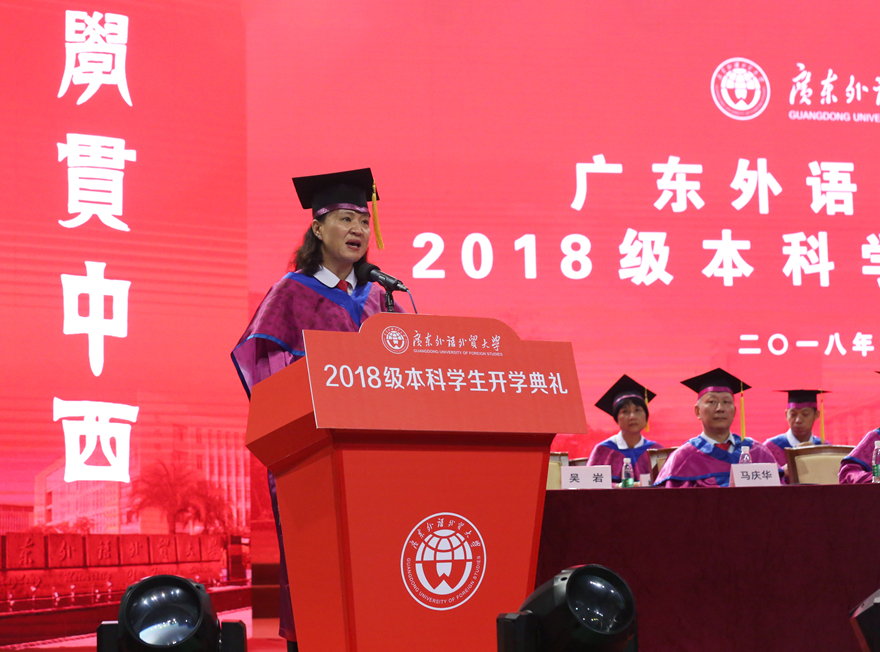 教师代表、英语语言文化学院副院长姜琳在北校区开学典礼的发言中给新生提出三点建议:第一,积极面对挑战,在战胜挫折的过程中成长。她倡导大家要始终以自强不息的精神,要尽快找到适合自己的学习方法,勇于探究,善于发问。第二,树立明确目标,选择人生方向。她希望同学们不仅要有家国情怀,还要注意发掘自己的兴趣爱好,做好自己的人生规划。教师代表、英语教育学院老师吴岩在南校区开学典礼上寄语新生:第一,追求高深知识,心存高远。她以拉丁语“curriculum ”(意即“跑道”),寄语新生在每次起跑中都努力锻造逻辑思维能力、判断力,创新能力。第二,沟通交流,获得成长。她希望同学们积极感受校园文化魅力,珍惜与老师和同学的交流机会。第三,学贯中西,全面发展。吴岩启发新生利用广外的图书馆、教室和体育场等资源,全面培养人文素养、独立思考能力等。