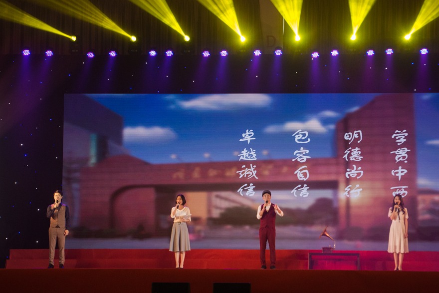 一首激情昂扬的《世纪宣言》拉开了晚会最终篇章的序幕。校友叶涛,和来自新闻学院的张昊天、王怡兰、吴麟宏声情并茂地为我们讲述广外建校以来的风雨历程。充满磁性的声线使得广外校园风光如画轴一般徐徐展开,启迪新生爱校荣校,勇敢地迈向未来。