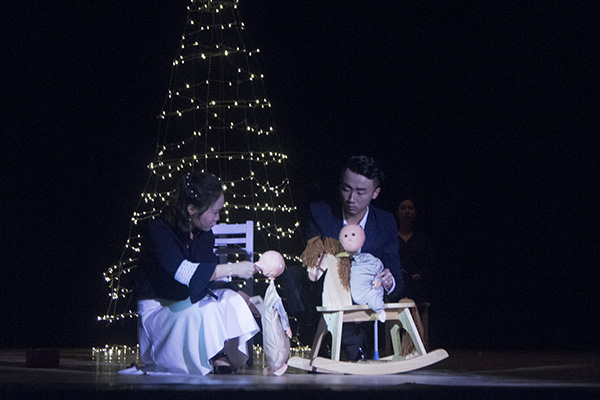 全剧的舞台设计十分简洁,在把握人物动作,揣摩角色内心方面更有可贵的创新。一开场,舞台之上,四位演员分坐在冰冷的白色木椅中,脸上映射着暗黄的灯光,他们呆滞的眼神、木然的表情无一不紧扣着“玩偶之家”的主题。道具的设置极富想象力,由线圈和彩灯组成的巨型圣诞树在结尾处崩塌,带走了舞台中最后一丝温暖,令观众不禁悲从中来。值得一提的是,由两个木偶饰演男女主角的孩子,反映出该剧导演在关注女性解放的同时还注重父母对孩子成长的影响,引人深思。