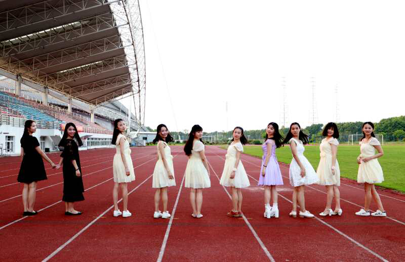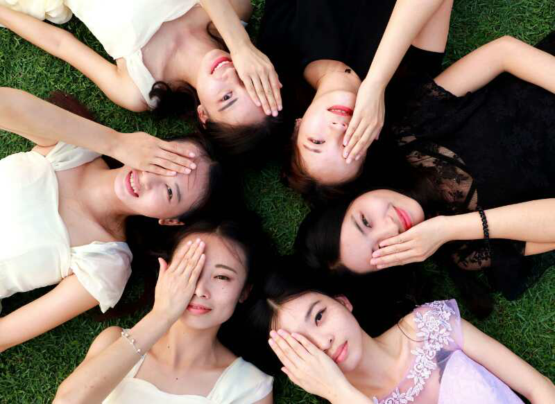六个女生围成圈,头靠头地躺在草地上,长发柔顺地垂落,礼服裙裙摆如花朵般在地上散开,她们一只手遮在右眼上,对着镜头莞尔一笑。这是会计学院民舞队的毕业写真。快门按下的那一瞬间,在照片中定格的不仅是她们的优雅美丽,更是她们对民舞队的深深眷恋与不舍。谈及为什么选择穿这条裙子拍摄毕业写真时,即将毕业的前任民舞队队长罗小婧说:“它不仅美,而且有纪念意义。”这条裙子是2015年会计学院毕业晚会民舞节目《多远都要在一起》的演出服,选择穿着它拍摄是一种特殊的纪念。