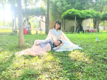 仲夏时节,瓦蓝瓦蓝的天空没有一丝云彩,语心湖畔,太阳透过树木密密层层的叶子,把阳光的圆影洒在地上,微风拂过,青葱的小草轻轻摇曳,两个身着汉服的女生,在草地上互相倚靠,目若秋波。对汉服情有独钟的商学院刘淑曼,穿上了汉服与大学四年作别。“这是我最喜欢的一套汉服,因为是量身定做的,我还在上面添加了一些自己的想法。”一袭纯色白暗条纹素雅仙双层浅交领广袖魏晋风长裙,显得她特别娴静。