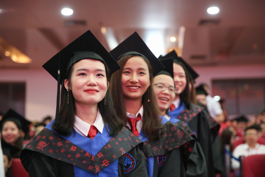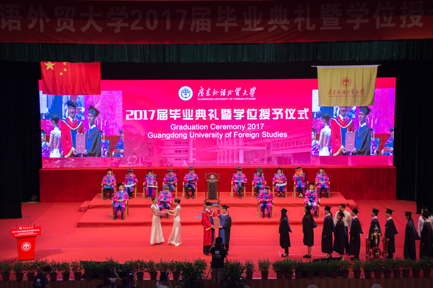 本网讯 河畔蝉鸣,花开仲夏。6月20日,2017届毕业典礼暨学位授予仪式首场在南校区大会堂拉开序幕。在毕业生们的大学最后一课上,我校党委书记、校长隋广军送上务实暖心的赠言,勉励毕业生们要“一步一个脚印走好未来路”,踏踏实实做事,老老实实做人,开启人生新篇章。隋广军逐一为毕业生颁学位证书并拨流苏。首场毕业典礼是经贸学院和新闻学院专场,接下来还将举行6个专场毕业礼。我校党委副书记石佑启,副校长何传添、阳爱民以及导师代表、校董代表、校友代表、家长代表出席本场毕业礼。本场毕业礼由何传添主持。