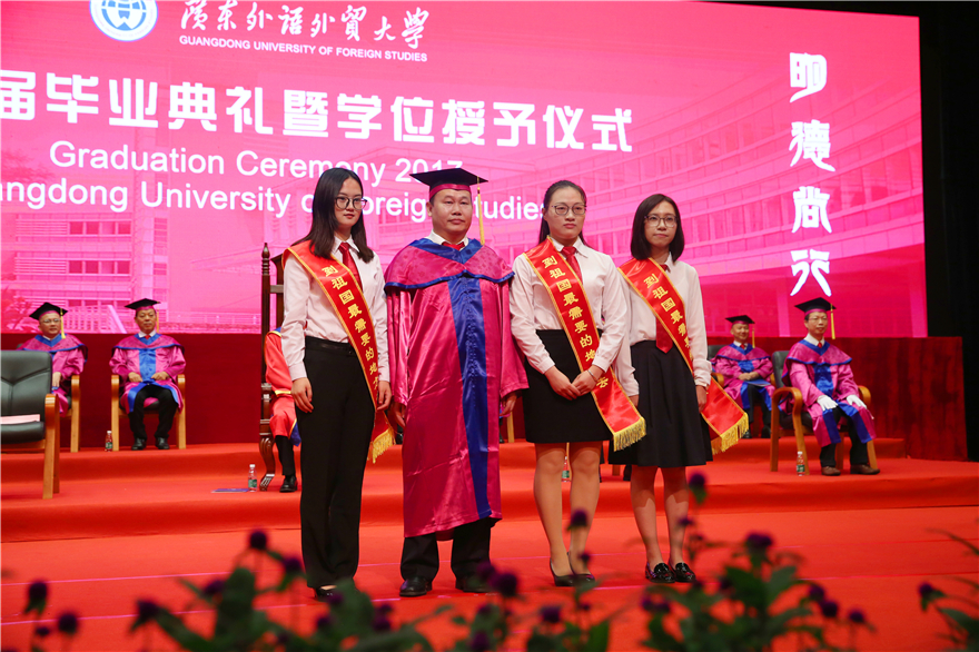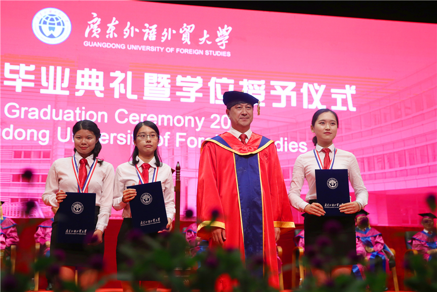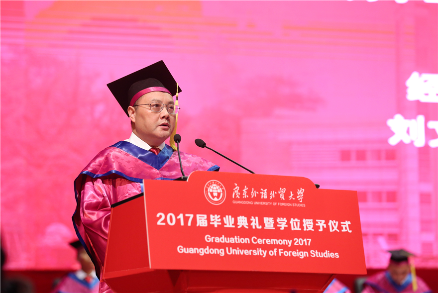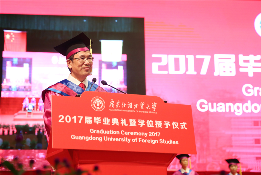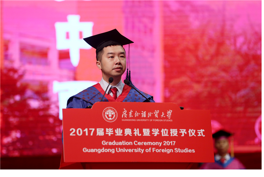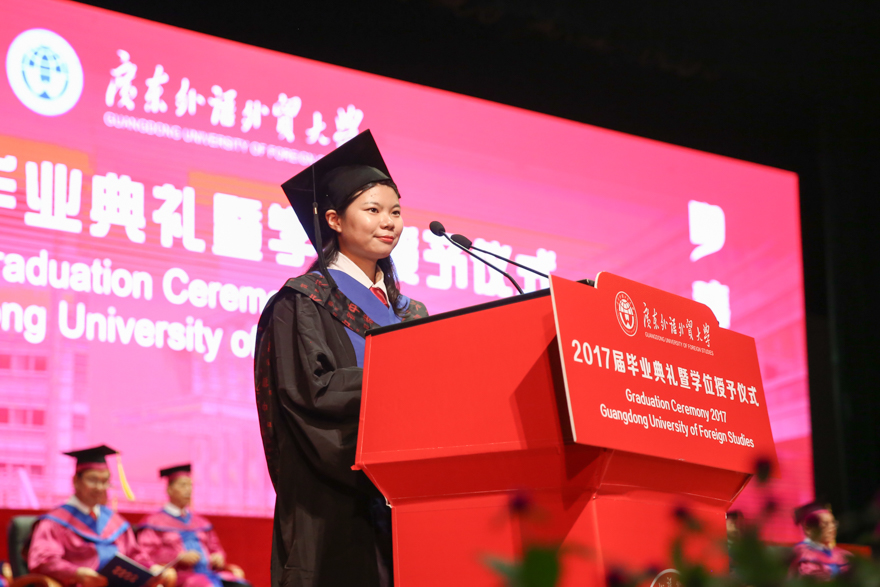 毕业生代表、来自经贸学院的彭敏静在发言中回忆了大学四年学校的变化和进步:学分制的试行、广外50周年校庆盛况、图书馆环境的改善......“CPU让我更加从容地展现自己,让我学会分析与思考,学会合作与竞争”,希望大家一起努力,“讲好广外故事,讲好中国故事”。