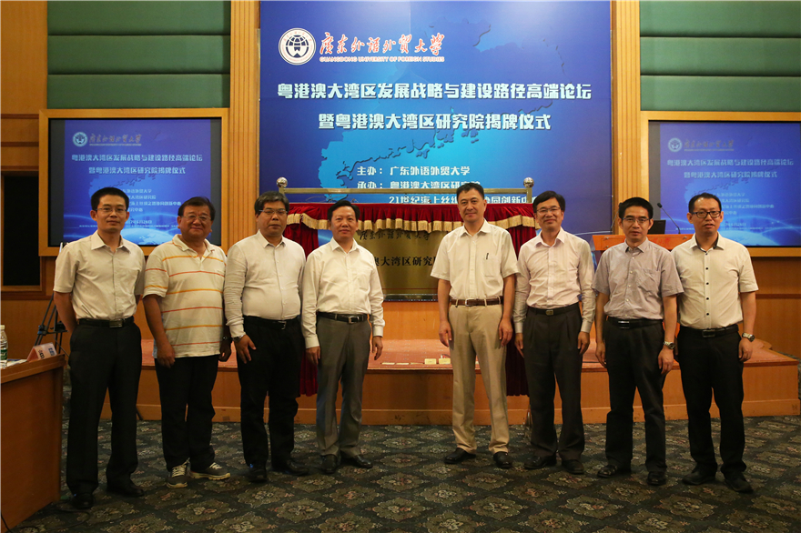 本网讯 6月24日上午,粤港澳大湾区发展战略与建设路径高端论坛暨粤港澳大湾区研究院揭牌仪式在北校区国际会议厅举行。来自国家发改委、商务部、广东省港澳办、广东省委党校、海通证券和高校的专家学者,以及政府、人民团体和企业的嘉宾80余人聚集一堂,以专业的眼光、学者的思维、全球的视野和超脱的理念对粤港澳大湾区谋篇布局,进言献策。与会专家一致认为,广东外语外贸大学粤港澳大湾区研究院的成立有利于共享信息资源和专家智慧,形成区域发展战略快速反应机制,服务于国家重大战略需求和“一国两制”框架下粤港澳深度融合的新体制建设,具有重大的战略意义。