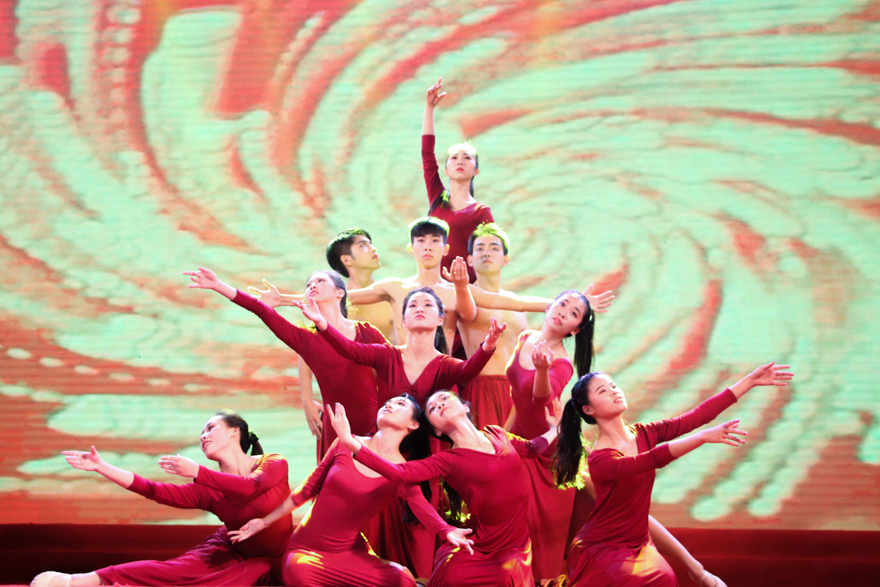 身披一袭红衣的校学生艺术团舞蹈队带来了舞蹈《众·程》。他们红衣飘扬,随着音乐的律动时而缓慢舒展,时而激扬有力,演绎出了如同史诗创世纪一般似火的激情。