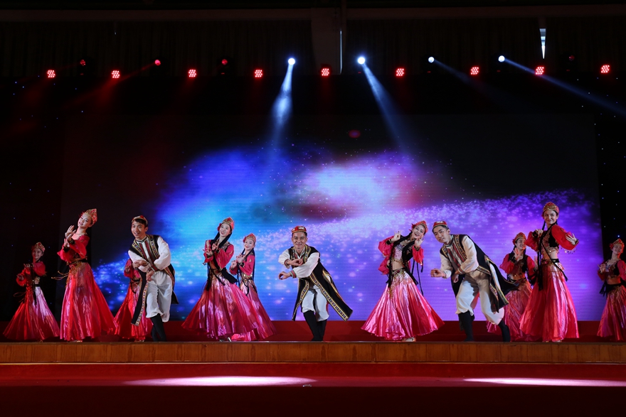 随后,少数民族艺术团和艺术学院舞蹈系共同为师生带来热情洋溢的新疆歌舞《掀起你的盖头来》。舞蹈队员曼妙的身姿随着欢快的音乐舞动,粉红色的裙摆随着舞蹈飘动,队员脸上自信迷人的微笑体现新疆风情。