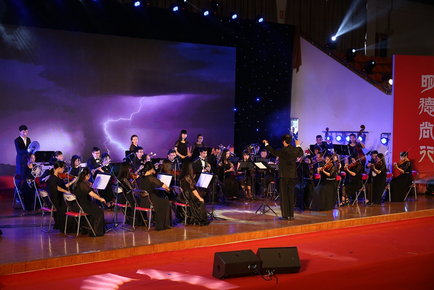 由校管弦乐团带来的世界名曲《雷电波尔卡》模仿出大自然中的疾风、雷雨和闪电的声音,仿佛让现场观众置身于雷电交加、大雨倾盆的场景中。这首激昂交错、震撼人心的合奏乐曲激励着新生在筑梦道路上无惧风雨,奋勇前行,用青春与汗水揭开人生新篇章。