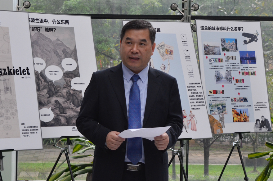 在波兰语言展览会开幕式上,焦方太在肯定了波兰在“一带一路”中扮演角色的重要性,并阐释了我校开设波兰语专业的重要性。