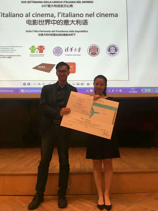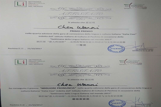 网讯 10月21日,由意大利驻华使馆文化处主办的第四届“意大利语桥”——全国高等院校意大利语言与文化知识竞赛在北京举行。“意大利语桥”是意大利语言文化周系列活动之一,也是全国意大利语专业学子最重要的才艺展示和知识交流的平台。我校西语学院意大利语系学生陈婉霓以发音与语言流畅度单项和总分均第一的成绩脱颖而出摘得桂冠,并且获得最佳发音奖。