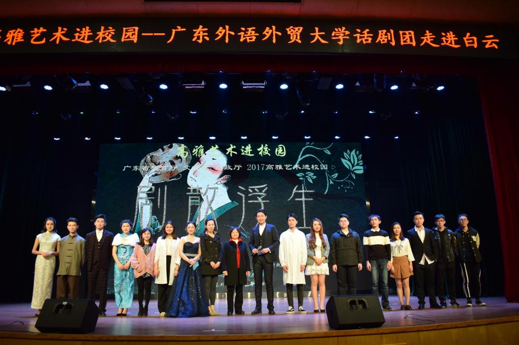 本网讯 12月12日,我校话剧队一行23人参加“高雅艺术进校园——剧散浮生”的主题演出活动,走进活动第一站——广东白云学院,演绎我校学生原创话剧《永生》和《倾城》,话剧队精彩的演出得到白云学院师生的一致好评。广东白云学院党委副书记李纯英等出席本次活动。