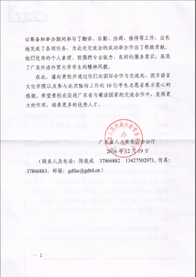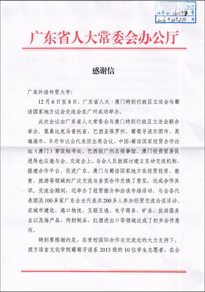 又讯 12月6日至8日,我校西方语言文化学院葡萄牙语系2013级的10位学生志愿者服务“广东省人大·澳门特别行政区立法会与葡语国家地方议会交流会”,在会议筹各和举办期间参与了翻译、后勤、协调、接待等工作,出色地完成了各项任务,为此次交流会的成功举办作出了积极贡献。他们优秀的个人素质、较强的专业能力、良好的服务意识,展现了我校学生的精神风貌,得到广东省人大常委会办公厅的来信感谢。在此,对参加本次志愿服务的同学们提出表扬,感谢相关组织单位的积极配合。