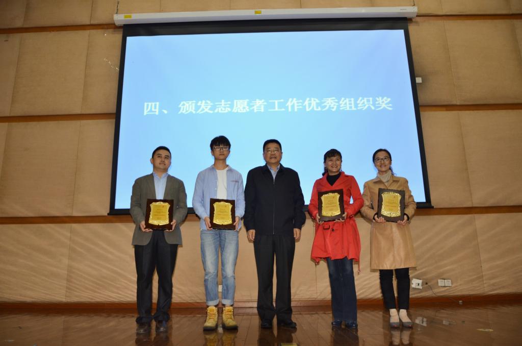 袁卫根宣读《关于表彰2016“一奖一会一节”志愿服务优秀组织单位及优秀志愿者个人的决定》,我校获评志愿服务工作优秀组织奖,77名志愿者被评为优秀志愿者。