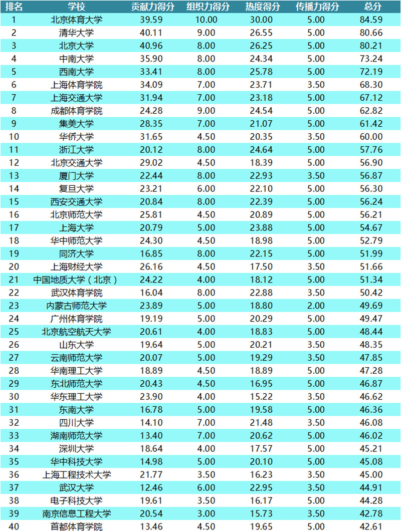 本网讯我校喜获2016年中国高校100强体育竞赛榜单第87名的排位,充分体现了我校在体育事业方面的竞争力。此次榜单由人民体育和人民网舆情监测室联合制作,中国大学生体育协会提供数据支持。参与本榜单评比的高校为2016年在国内外的大学生体育赛事比赛中获得名次的学校,共涉及赛事60余个,指标20余项,最后从贡献力,组织力,传播力和影响力四个方面综合评出。
