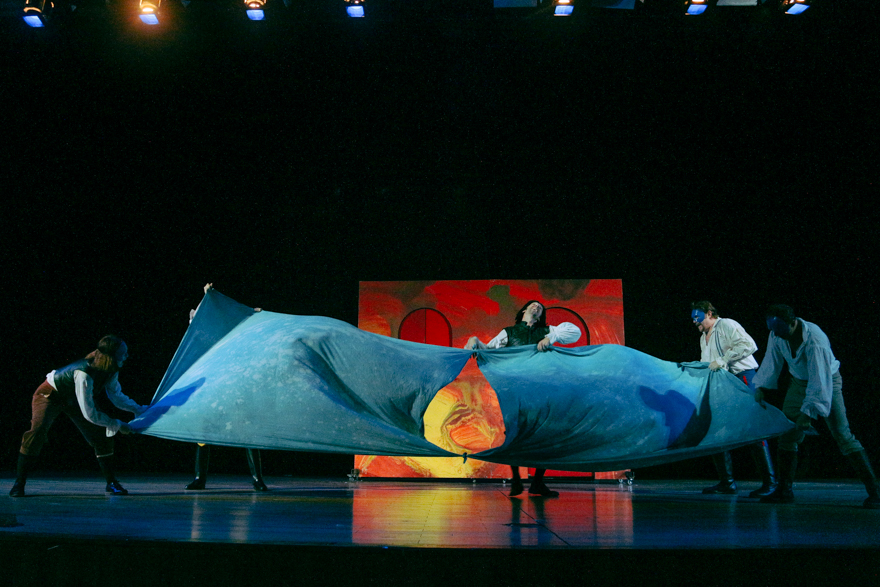 灰暗的灯光下,深蓝色的幕布随风飘扬,在五位话剧演员的齐声吟唱中,剧场的帷幕缓缓拉开。女主薇奥拉身着一袭白色长袍,她目光坚定,身体随着蓝布的抖动而起伏,同时用令人惊恐的低沉声音诉说着凄凉的往事,海上遇难场景呼之欲出。随着场景的切换,安德鲁系上围裙,托比手持厨具,他们将厨具声作为配音,吟唱着带有自嘲意味的歌曲,配合小丑夸张的舞蹈动作,上演了一出深夜闹剧。简单逼真的道具,自如转换的灯光,再联合现场音效带来的听觉冲击力,牢牢地抓住了现场观众的心。
